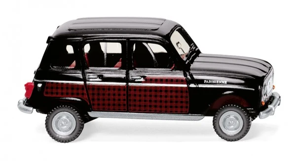 Pariser Lebensart mit rotem Modemuster auf den Flanken Dieser R4 zeigt auch in der 87-fachen Verkleinerung ein Stück französischer, gar Pariser Lebenskultur. Die Version Parisienne überraschte mit einem schmucken Interieur und einem roten Lackmuster, das auf der schwarzen Karosserie erst so richtig Wirkung entfachte. Es war nur eine von vielen Varianten, die in der langen Geschichte des R4 immer wieder für Aufmerksamkeit sorgten. Im Dezember 1963 präsentierte Renault den zusammen mit dem Modemagazin „Elle“ aufgelegten R4 „Parisienne“. Kennzeichen sind Schotten- und Geflechtmuster auf den Türen und am Heck. In Deutschland zählte der „R4“ zu Produktionszeiten zu den wendigen und kostengünstigen Kleinwagen aus ausländischer Produktion – ein typisches Familienauto eben. Der französische Kompaktwagen mit praktischer Heckklappe war damals freilich weit vom heutigen Klassikerstatus entfernt – ein Alltags- und Gebrauchsauto. Karosserie, Fahrgestell und Kühlergrill schwarz. Verkehrsrote Inneneinrichtung mit schwarzem Lenkrad. Stoßstangen vorn und hinten silbern lackiert. Rücklichter rot bedruckt, Tankdeckel schwarz bedruckt. Vordere Blinker orange bedruckt, Scheiben- und Fensterbegrenzung gesilbert. Rote Musterlackierung von den Türen nach hinten umlaufend bedruckt. Heckseitig „4PARISIENNE“-Schriftzug in silber, seitliche Türgriffe und Kühlergrillzierrat mit Logo ebenfalls in silber.