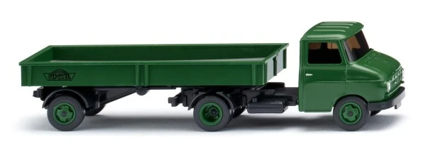 Ein kleiner, feiner Opel-Sattelzug unter Kurzhauber-Führung Opel hatte das WIKING-Vorbild schon bei der Kurzhauer-Vorstellung im Programm präsentiert. Ganz nach Vorbild der Karosserie-Schmiede „Dinkel“ war der „kleine“ Sattelzug im damaligen Opel-Prospekt zu sehen. WIKING-Gründer Fritz Peltzer entschied sich, den Opel Blitz in gleich mehreren Varianten zu bauen. So fand der von Opel 1960 vorgestellte Blitz-Kurzhauber als Pritschensattelzug wenig später seine WIKING-Programmpräsenz. Heute sind Auflieger mit Opel Blitz-Zugmaschine eine wirkliche Seltenheit in der breiten Schar der Klassiker. Laubgrünes Fahrerhaus. Getönte Verglasung, frontseitig gesilberter Zierrat sowie Opel-Logo und Scheinwerfer gesilbert. Türgriffe silber. Fahrgestell mit Sattelplatte und Kotflügel in schwarzgrau. Felgen in laubgrün. Laubgrüne Aufliegerpritsche mit mausgrauem Einlegeboden. Aufliegerfahrgestell und hintere Kotflügel in schwarzgrau. Heckleuchten an Zugmaschine und Auflieger rot bedruckt. Pritsche mit Logo „Dinkel“ in schwarz.