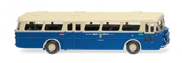 Im Wirtschaftswunder-Bus das Sauerland erleben So war der Büssing Senator einst von Lüdenscheid auf dem Weg ins Märkische. Der Kraftverkehr Mark-Sauerland setzte den Braunschweiger Linienbus mit der Wagennumer 38 lange Jahre im Alltagsbetrieb ein. WIKING miniaturisierte den Bus schon 1965 entsprechend der damals durchaus oft vorzufindenden Bicolorgestaltung, indem Karosserieober- und -unterteil formtechnisch als getrennte Bauteile angelegt wurden. Das macht die optimale Nachbildung des Originals jetzt perfekt. Karosserieunterteil verkehrsblau, Karosserieoberteil hellelfenbein. Inneneinrichtung alpenblau, Lenkrad perlweiß eingesetzt. Trilexfelgen hellelfenbein. Frontseitig silberne Büssing-Spinne sowie zweifarbiges Büssing-Logo. Blinker vorn und am Heck orange bedruckt, Heckleuchten rubinrot bedruckt. Seitliche Zierstreifen und Kotflügel gesilbert, grüne Pfeilflächen sowie verkehrsroter Aufdruck von Einstieg und Ausstieg. Wagennummer „38“ weiß gehalten. Beidseitige Bedruckung mit Schriftzug „Kraftverkehr Mark-Sauerland GmbH“ sowie Wappen Lüdenscheid. Frontseitig silberne Scheibenwischer und Mittelsteg in Dachfarbe.