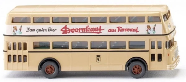 Vor den einstigen Berliner Modellbauwerkstätten von WIKING in Lichterfelde fuhren sie Dutzende Male am Tag vorbei – der D2U war der Doppelstockbus, der auf Büssing-Fahrgestell die Wirtschaftswunderjahre im Westen Berlins prägte. Dass WIKING-Gründer Friedrich Peltzer an seinem Stammsitz in Lichterfelde einst bei Modellbaumeister Alfred Kedzierski den Musteraufbau des charaktervollen Berlin-Busses beauftragte und Monate später dann am Stammsitz Unter den Eichen 101 die ersten Modelle aus den Stahlformen purzelten, macht die besondere Bedeutung gerade dieses modellbauerischen Meilensteins aus. Diesmal lässt WIKING den D2U mit Doornkaat-Werbung ins Programm fahren. Die charakteristischen Doppelstockbusse mit der filigranen Büssing-Spinne an der Front stehen heute unverändert für die Berliner Aufbruchjahre, die auch der Westen der geteilten Stadt erlebte und die der Werbeauftritt der omnipräsenten Busse widerspiegelt. Diesmal bewegt sich die 1:87-Miniatur auf der Linie 73 und fährt zielgerichtet zum damals wichtigsten West-Bahnhof Zoo.