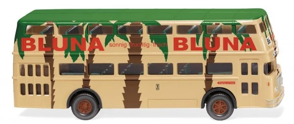 So machte der Berliner Doppeldecker Durst auf Bluna Kein Zweifel, der Bluna-Bus machte Durst auf Limo! Dabei sorgte der Büssing D2U in seinem West-Berliner Einsatzgebiet einst für einen Hingucker. Anders als heute waren vollflächige Busgestaltungen keinesfalls selbstverständlich und auch bei der BVG eher die Ausnahme. Die mächtigen Bluna-Lettern im leuchtenden Flower-Power-Orange waren eingebettet in eine gestalterische Palmenwelt, die von der exotischen Fruchtherkunft kündete. Vor den einstigen Berliner Modellbauwerkstätten von WIKING in Lichterfelde fuhren die Doppeldeckerbusse wahrscheinlich Dutzende Male am Tag vorbei – der D2U prägte die Wirtschaftswunderjahre im Westen Berlins. Dementsprechend trägt der Bluna-Bus auch das Zielschild von Steglitz. Die charakteristischen Doppelstockbusse mit der filigranen Büssing-Spinne an der Front stehen heute unverändert für die Berliner Aufbruchjahre, die auch der Westen der geteilten Stadt erlebte und die der Werbeauftritt der omnipräsenten Busse widerspiegelt. Karosserie beige, Inneneinrichtung moosgrün, Lenkrad schwarzgrau. Felgen rehbraun gehalten. Fahrgestell schwarz. Handbemalte Scheinwerfer, Stoßstange und Büssing-Spinne chromsilber bedruckt. Busfahrer basaltgrau mit handkoloriertem Gesicht. Zielschild „Steglitz“ mit der Liniennummer „86“. Seitliche Bedruckung der schwarzen Stoßleisten und Kotflügelbegrenzungen sowie BVG-Logo. Aufwendige Bluna-Werbung mit karosserieüberlaufender Palmenoptik. Rückleuchten rot.