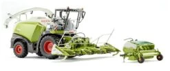 Sandwichklappung auch in 1:32 funktionsgerecht simulierbar:Und natürlich erfüllt der Jaguar 860 mit zwei Anbaugeräten sogleich umfassende Ernteaufgaben. Das reihenunabhängige Maisgebiss Orbis kombiniert auch im Maßstab 1:32 die Praxiserfahrungen mit innovativen Ideen in puncto Aufbau und Antrieb. Der Kraftschluss zum Jaguar-Vorbild kann einfach über den Schnellkuppler herbeigeführt werden. Außerdem ist ein optimaler Gutfluß gewährleistet, so dass durch die Längszuführung der Pflanzen eine konstante Häckselqualität gewährleistet wird. Je nach Wunsch und Einsatzsimulation lässt sich das Maisgebiss Orbis 750 auch in der 32-fachen Miniaturisierung an- und abbauen. Vorbildgerecht kann auch der Straße-Feld-Betrieb simuliert werden, wenn das Maisgebiss seitlich ein- und ausgeklappt wird, so dass die sogenannte Sandwichklappung auch modellbauerisch nachempfunden werden kann. Die verschiedenen Einzugswalzen lassen die zentrale Funktion des Maisgebisses sichtbar werden, denn diese sind von WIKING ebenfalls drehbar angeordnet. Die zugehörigen Rohrhalterungen werden überdies klappbar vorgehalten.Sogar Schmutztuch und Tasträder beweglich ausgeführt:Das zweite Anbaugerät gilt der Futterernte. Die Pick up 300 beweist, was auch beim Vorbild unerlässlich ist. Auf dem Weg zu immer leistungsstärkeren Feldhäckslern und höheren Erträgen werden Anforderungen wie saubere Futteraufnahme, robuste Technik und einfache Bedienung immer bedeutender. Die Pick up 300 erfüllt mit einer Arbeitsbreite von drei Metern die wesentlichen Effizienzansprüche. So kann die Pick up PU 300 von WIKING bei Bedarf an- und abgebaut werden. Das Schmutztuch ist beweglich angeordnet, während der Rollenniederhalter dreh- und höhenverstellbar ist. Selbstverständlich lässt sich die Pick up vorbildgerecht öffnen. Genauso wirklichkeitsnah sind beide Tasträder klappbar ausgeführt.