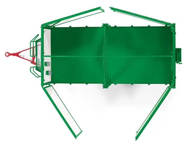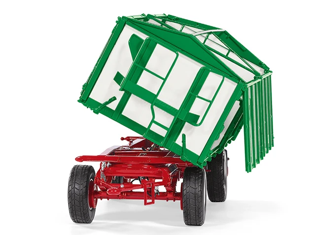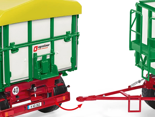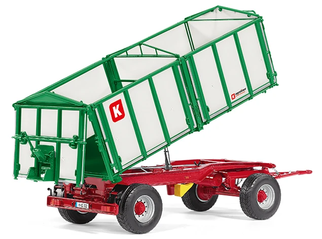 Authentische Kippvarianten beim Kröger HKD 302 Mit dem Kröger HKD 302 fährt ein vollfunktionaler Dreiseitenkipper ins 1:32-Programm. WIKING macht den Kipper zu einem attraktiven Präzisionsmodell, weil sich vielfältige Funktionen, wie die unterschiedlich zu öffnenden Klappen, auch im Modell nachahmen lassen. Das Vorbild verkörpert einen Standard, der der Großlandwirtschaft entgegenkommt. Sein Leergewicht liegt bei maximal 4,6 Tonnen, die Nutzlast bei 14 Tonnen. Damit erreicht der Kröger HKD 302 ein Ladevolumen von 22,8 m³. Die Ladefläche nutzt mit einer Länge von 5,3 Meter und einer Breite von 2,55 Metern die Möglichkeiten des Straßenverkehrs vollends aus. Zweckmäßig, alltagstauglich und vorbildgerecht, so hat sich der 18 Tonnen Gliederzug in der Landwirtschaft als das wirtschaftlichste und flexibelste Transportgespann etabliert. Die Authentizität des Vorbilds hat WIKING auch in den Maßstab 1:32 transferiert. Das Fahrgestell mit Drehschemel und Deichsel ist aus Zink gehalten. Während die Pritsche mit ihren Bordwänden in authentischer Gestaltung erscheint, macht die filigrane Markenbedruckung den Originalauftritt komplett. Die Bereifung erfolgt mit typischem Straßenprofil, die Felgen hat WIKING ganz nach dem Kröger-Vorbild originalgetreu verkleinert. Die Blattfedern der Achsen simulieren die realistische Federfunktion. Der Hubzylinder verfügt über volle Teleskopier- und Schwenkbarkeit. Filigran nachgebildet ist das vordere Anhängerpodest. Die heckseitige Stoßstange erscheint aus Metall und komplettiert den detailfeinen Auftritt durch eine mittig eingebaute Anhängerkupplung mit typischer Zugmauloptik. Die hintere Anhängerbeleuchtung besteht ebenso aus Kunststoff wie die Kotflügel.