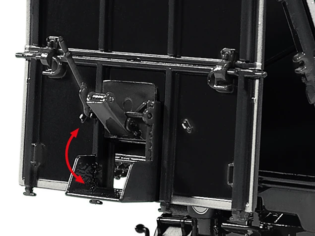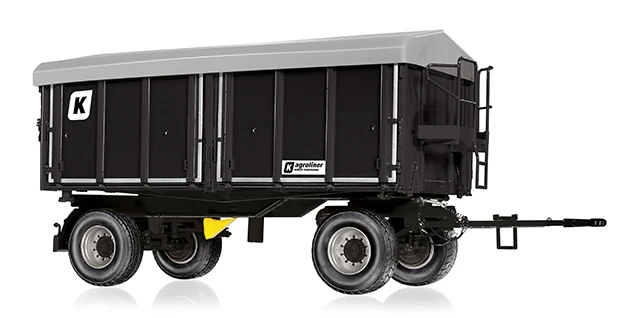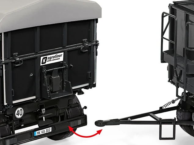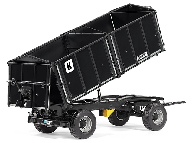 Puristische Optik für Vielzweck-Anhänger Das topaktuelle Erscheinungsbild des Kröger HKD 302 bringt den Purismus im Landmaschinenbau auf den Punkt – der Transportanhänger erhält ein individuelles, serienkontrastierendes Design. Dabei bleiben die Funktionen allesamt unangetastet. Die WIKING-Konstrukteure haben sich mit aller Liebe zur Präzision und Funktionsfähigkeit der Bauteile dem HKD 302 gewidmet. Ihm gelingen die vielseitigsten Kippbewegungen, ganz gleich ob rechts, links und heckseitig – in jeder Position macht der Kipper HKD 302 eine Top-Figur. Der vollfunktionale Dreiseitenkipper wertet einmal mehr das 1:32-Programm auf, zumal WIKING diesen großvolumigen Anhänger zu einem attraktiven Präzisionsmodell gemacht hat. Das Vorbild verkörpert einen Standard, der der Großlandwirtschaft entgegenkommt. Sein Leergewicht liegt bei maximal 4,6 Tonnen, die Nutzlast bei 14 Tonnen. Damit erreicht der Kröger HKD 302 ein Ladevolumen von 22,8 m³. Die Ladefläche nutzt mit einer Länge von 5,3 Meter und einer Breite von 2,55 Metern die Möglichkeiten des Straßenverkehrs vollends aus. Zweckmäßig, alltagstauglich und vorbildgerecht, so hat sich der 18 Tonnen Gliederzug in der Landwirtschaft als das wirtschaftlichste und flexibelste Transportgespann etabliert. Die Authentizität des Vorbilds hat WIKING auch in den Maßstab 1:32 transferiert. Das Fahrgestell mit Drehschemel und Deichsel ist aus Zink gehalten. Während die Pritsche mit ihren Bordwänden in authentischer Gestaltung erscheint, macht die filigrane Markenbedruckung den Originalauftritt komplett. Die Bereifung erfolgt mit typischem Straßenprofil, die Felgen hat WIKING ganz nach dem Kröger-Vorbild originalgetreu verkleinert. Die Blattfedern der Achsen simulieren die realistische Federfunktion. Der Hubzylinder verfügt über volle Teleskopier- und Schwenkbarkeit. Filigran nachgebildet ist das vordere Anhängerpodest. Die heckseitige Stoßstange erscheint aus Metall und komplettiert den detailfeinen Auftritt durch eine mittig eingebaute Anhängerkupplung mit typischer Zugmauloptik. Die hintere Anhängerbeleuchtung besteht ebenso aus Kunststoff wie die Kotflügel.