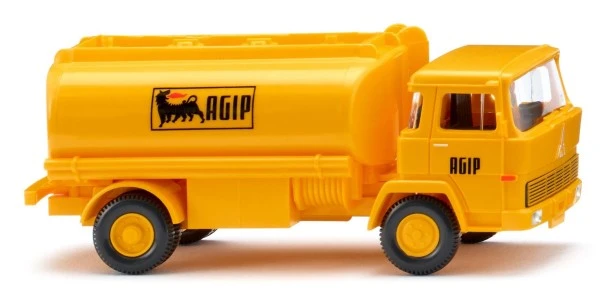 Der Tanker für die süddeutschen Agip-Stationen Der Magirus-Tankwagen nach Mannheimer Aurepa-Vorbild präsentiert bei WIKING erstmals die gelben Agip-Markenfarben. Agip steht für das Tankstellennetz des italienischen Mineralöl- und Energiekonzerns Eni, das sich seit den Sechzigerjahren vor allem in Süddeutschland engagiert. Das Unternehmen wurde im Jahr 1926 gegründet und 1953 in die neu gegründete Eni integriert. Eni Deutschland GmbH ist heute eine 100%ige Tochtergesellschaft von Eni und eine der großen Mineralölgesellschaften in Deutschland. Eni Deutschland verantwortet die Bereiche Einkauf und Verarbeitung von Rohölen sowie den Vertrieb von Mineralölprodukten und betreibt unter der Marke Agip und Eni ein Netz von rund 480 Service-Stationen. Fahrerhaus, Fahrgestell mit Felgen und Tankaufbau in gelb, Inneneinrichtung anthrazitgrau. Anthrazitgrauer Kühlergrill mit gelber Bedruckung. Fahrerhaus mit gesilbertem Magirus-Logo, auf den Fahrerhaustüren schwarzer Agip-Schriftzug. Seitliche Tankbedruckung mit schwarz-rotem Agip-Logo sowie schwarzem Schriftzug. Heckseitig schwarz-rotes Agip-Logo. Rückleuchten rot. Türgriffe und Scheinwerfer gesilbert. Blinker orange.