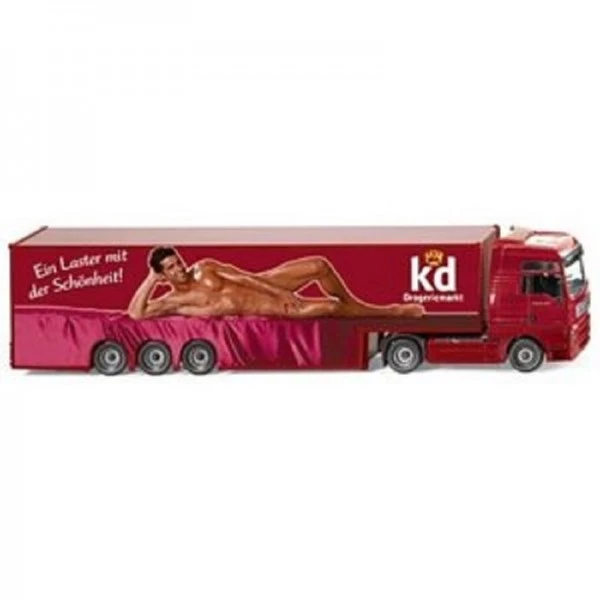 Zu den Spezialisten in den Fuhrparks europäischer Logistiker zählen inzwischen Auflieger, die eigens für Volumentransporte konstruiert wurden. Vorzugsweise werden sie von Auftraggebern für die Beförderung sperriger, aber keinesfalls gewichtiger Ware genutzt. Die “kd-Drogeriemärkte” nutzen genau diese Aufliegergeneration, um die regelmäßige Belieferung ihrer Shops in ganz Deutschland gewährleisten zu können. Dabei bieten sich die Auflieger als ideale Werbeträger an. Freilich sprechen die Marketing-Experten von “kd” vorzugsweise das weibliche Klientel an. Kein Wunder also, dass sich “Ein Laster mit der Schönheit” präsentiert und sich das fotografierte Männermodell zum Blickfang eignet – dem Sammler kann’s angesichts des harmonischen Gesamtauftritts nur recht sein.Fahrerhaus, vordere Kotflügel, Schürze in RAL 3003. Fahrgestell, Sonnenblende und Lenkrad in schwarz. Hintere Kotflügel, Kühlergrill und Inneneinrichtung in grau. Rückspiegel, Ansaugstutzen in schwarz, Sattelplatte und Felgen in silber. Die Verglasung ist in hellblautransparent gehalten. Die Frontscheinwerfer sind transparent, die Blinker orange-transparent und die Rückleuchten rottransparent eingesetzt. Frontseitige Bedruckung von Scheibenwischern und Griffen in schwarz. Seitliche Streben am Fahrerhaus zwischen Fenster und Spiegelaufsatz in schwarz. Typenkennzeichnung “TG 460 A” und XXL” in silber gehalten. Der Kühlergrill mit Schriftzug und Logo MAN erscheinen in silber.Kofferauflieger in RAL 3003 ebenso die Achshalterung. Fahrgestell in schwarz gehalten. Dreiseitiges Werbemotiv der kd-Drogeriemärkte.