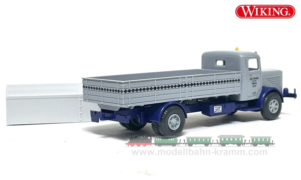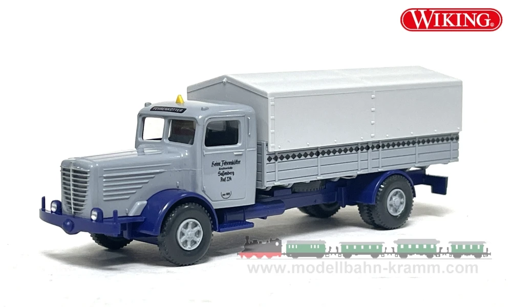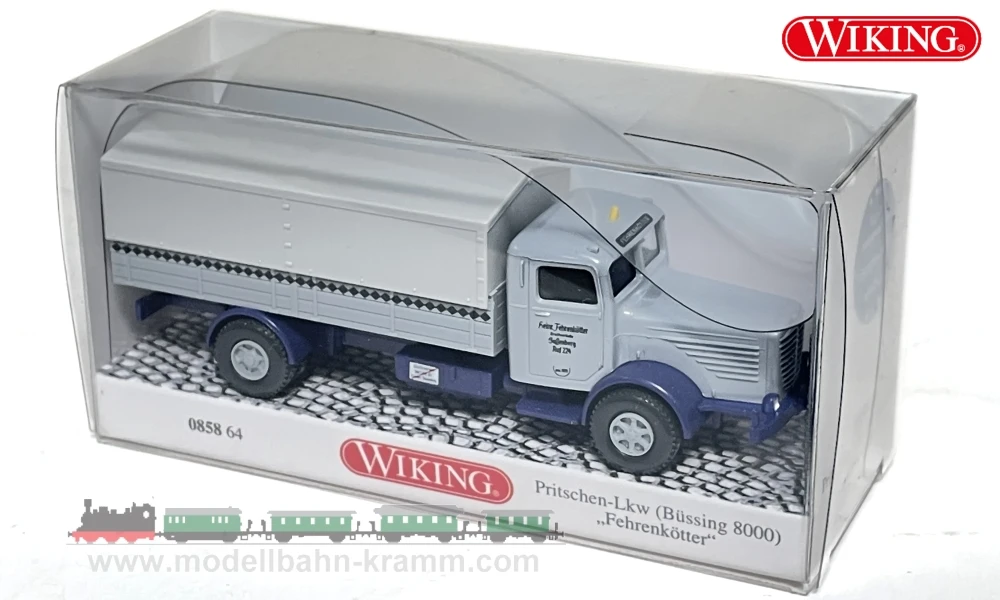 Wie immer in enger Anlehnung an ein Vorbildfahrzeug erscheint ein Büssing 8000 Pritschenlastwagen mit lichtgrauer Plane der Spedition „Fehrenkötter“.