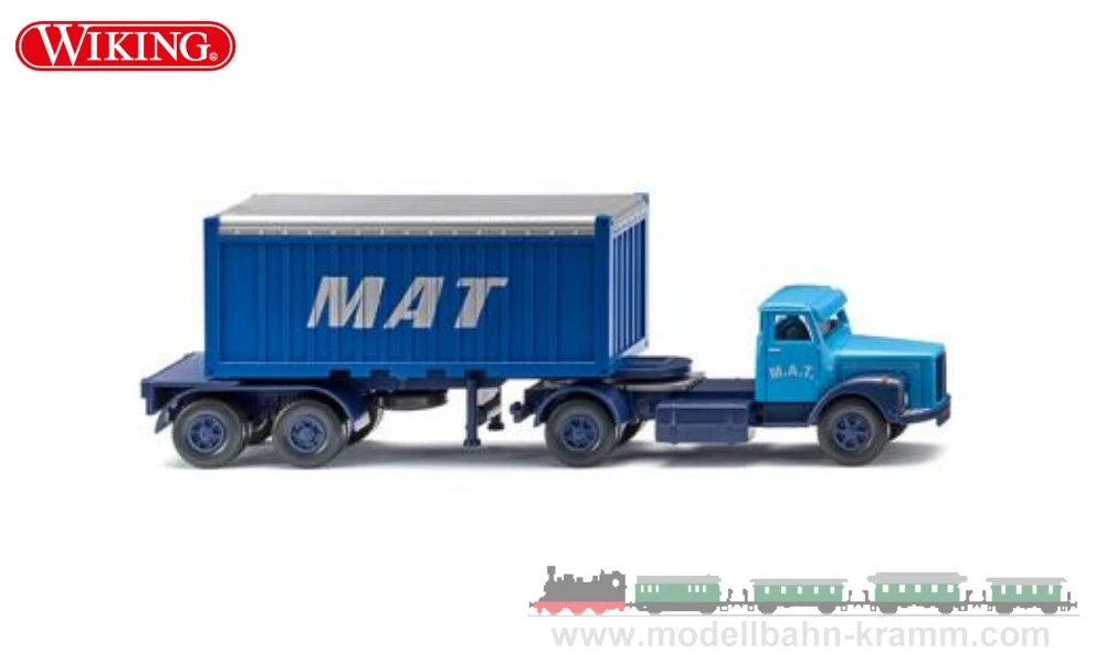 Zugmaschinenfahrerhaus mit Sonnenblende lichtblau. Fahrgestell mit Kardanteil und Felgen saphirblau. Inneneinrichtung graublau. Kühlergrill saphirblau bedruckt. Auf dem Kühlergrill rot-silbernes Scania-Logo. An den Seiten Typenzeichen Scania 111 sowie Scania-Schriftzug und Türgriffe silbern bedruckt. Zusätzlich silberner Schriftzug „M.A.T.“. Fahrgestell mit orangenen Blinkern, gesilbertem Riffelblech und heckseitig roten Rückleuchten. Auflieger mit Fahrgestell, Doppelkotflügel und Felgen saphirblau. Fahrgestell heckseitig mit silbernem „M.A.T.“-Schriftzug. Heckleuchten rot bedruckt. Enzianblauer Open-Top-Container mit silbernem Dach und seitlich silberner „M.A.T.“-Bedruckung.