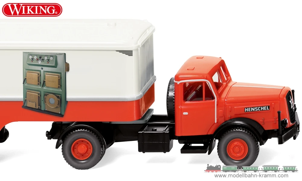 Zugmaschine mit blutorangem Fahrerhaus und Felgen. Inneneinrichtung basaltgrau. Vordere Kotflügel mit Scheinwerferleiste sowie Kühlergrill, Fahrgestell und Kardanwelle, aber auch hintere Kotflügel schwarz. Motorhaube mit gesilberten Scharnieren sowie drei schwarz bedruckten Schnallen und gesilbertem Henschel-Schriftzug auf schwarz bedruckter Grundfläche. Seitliche Zierleisten und Türgriffe gesilbert. Vordere Scheinwerfer sowie Henschel-Stern auf dem Kühlergrill silbern bedruckt, heckseitige Rückleuchten karminrot. Kofferunterteil mit Türgravur blutorange, weißes Kofferoberteil mit ergänzender Türgravur. Dach und heckseitige Türen ebenfalls weiß. Schwarze Stützrollen und Doppelkotflügel, Felgen blutorange. Seitlich silberne Zierstreifen sowie schwarzer Schriftzug Bruns-Heizkessel und schwarze Lüftungsschlitze. Heckseitig ebenfalls schwarzer Schriftzug Bruns-Heizkessel sowie gesilberte Zierstreifen. Darunter stehend Telefonnummer und weißer Hinweis Seit 1949.