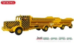 Verkehrsgelbes Fahrerhaus mit basaltgrauem Interieur. Warndreieck verkehrsgelb eingesteckt. Fahrgestell mit Kotflügel, Trilexfelgen und Kippmuldenaufbau verkehrsgelb. Fahrerhaus mit Haube sowie seitlicher Kipper mit schwarzer Warnschraffur. Scheinwerfer vorn gesilbert. Anhänger mit verkehrsgelbem Fahrgestell, Trilexfelgen, Deichsel und Muldenaufbau. Seitlich schwarze Warnschraffur.