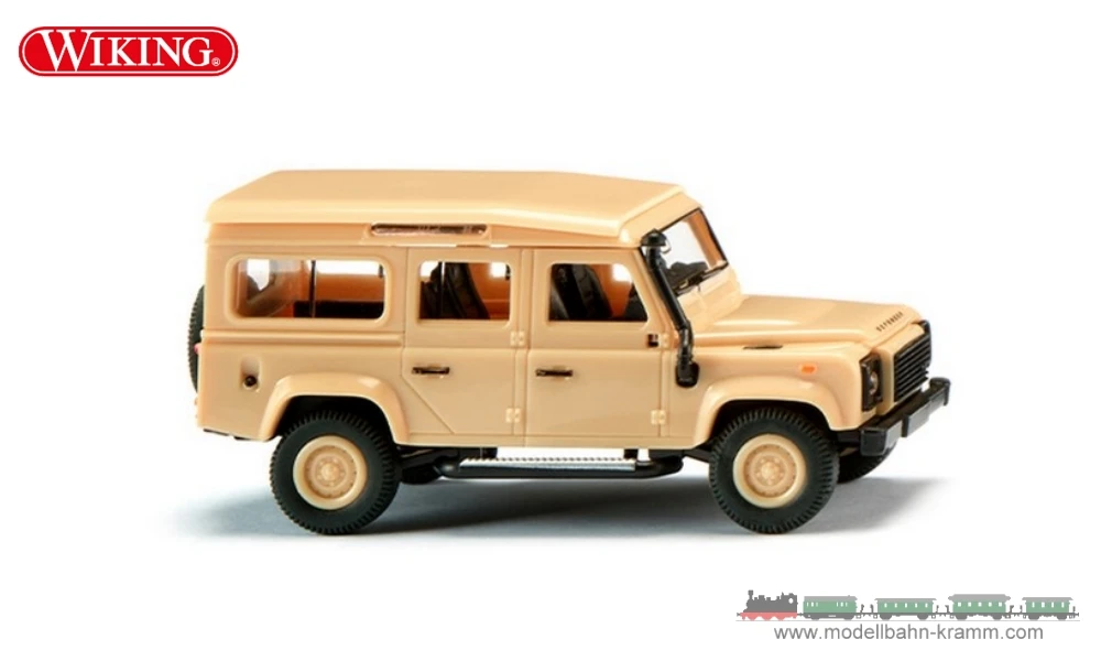 WIKING wählt die fünftürige Karosserie, die dem Defender in der 87-fachen Miniaturisierung zu einem imposanten Allrad-Klassiker verhilft. Karosserie, Tropendach und Felgen beige. Fahrgestell mit Luftansauger, Rückspiegel, aber auch Basisrahmen und Inneneinrichtung mit Armaturenbrett schwarz. Frontseitiger Defender-Schriftzug in dunkelgrau, Fensterrahmen und Kühlergrill sowie Türgriffe und Tankdeckel schwarz bedruckt. Seitlicher Blinker orange, heckseitig rote Rücklichter, Blinker orange sowie Rückfahrlicht silbern bedruckt. Land Rover-Logo grün-gold bedruckt, Defender-Schriftzug dunkelgrau