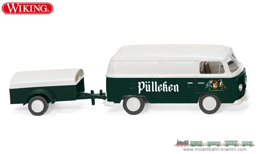 Karosserie und Fahrgestell weiß, Inneneinrichtung mit Drei-Speichen-Lenkrad schwarz. Anhängerkupplung ebenfalls schwarz. Felgen weiß. Umlaufende Karosseriegestaltung im unteren Bereich Veltins-grün. Frontseitig weißes VW-Logo aufgedruckt. Gesilberte Türgriffe. Mehrfarbiges Pülleken-Logo auf den Türen, weißer Pülleken-Schriftzug auf den Flanken. Heckseitig rote Rücklichter und Klappengriffe silbern bedruckt. Anhängerunterteil Veltins-grün, Anhängerdeckel weiß. Felgen ebenfalls weiß.
